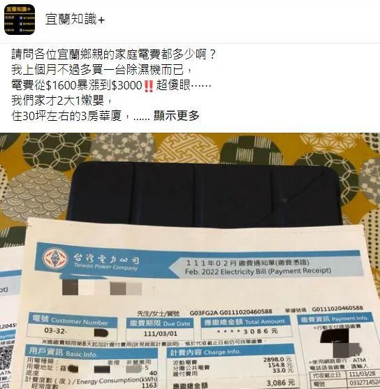 女網友在臉書「宜蘭知識+」發文詢問「難道除濕機比冷氣耗電?」,她表示,家住在30坪3房的華夏,上個月買了一台除濕機,每天開5~8小時,家裡電費突然從1600元漲到3000元,「夏天電費也不過1800元左右!」