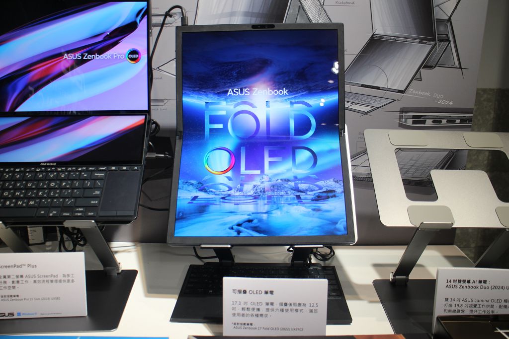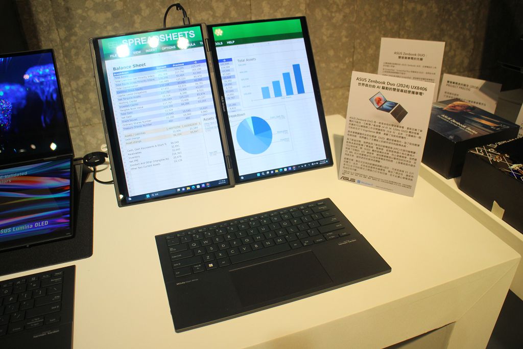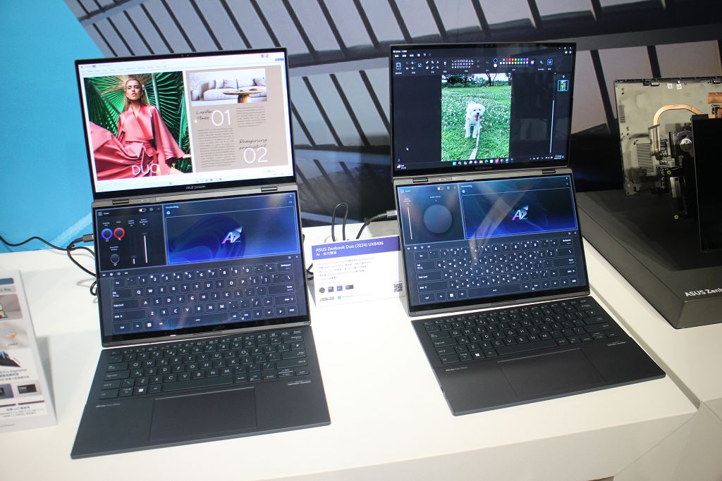 華碩於CES 2024推出全球首款搭載兩個14吋OLED觸控螢幕的AI筆電「ASUS Zenbook Duo雙14吋OLED觸控螢幕筆電」,重量僅1.35公斤起,180° 轉軸連接兩個16:10 ASUS Lumiana OLED螢幕,可搭配整合式支架和可拆的全尺寸ASUS ErgoSense鍵盤,依照使用情境需求隨意切換桌機、筆電、分享及雙螢幕四種模式。