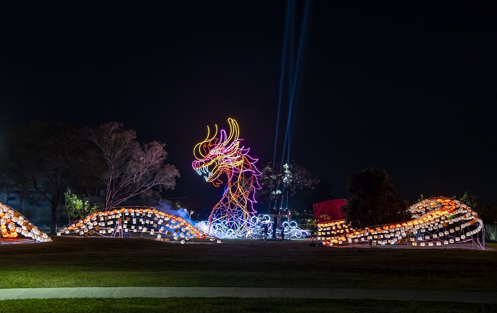 其中,最引人注目的主燈「龍躍屏東」高達15公尺,華麗的龍身串起192公尺的燈龍,鄉親更可參與祈福活動,留下祝福簽名,將祝福卡片掛在龍鱗片的燈籠上,為大家帶來滿滿的祝福。萬年溪燈區以「無限之光」為主題,將萬年溪比喻為巨龍,透過竹編雕塑呈現出閃閃麟光的龍身,並結合復興公園的水舞燈光秀,打造出充滿震撼感的龍年氛圍。