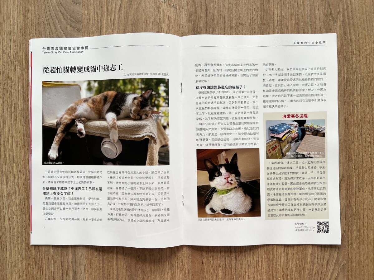 本期雜誌「台灣流浪貓關懷協會」專欄特別採訪了中途志工王愛媽的故事,希望能藉此與民眾分享,因為「貓」而帶來的每個溫馨時刻以及改變生命中的點點滴滴。從以前愛狗怕貓,因緣際會下轉為超級貓奴,忙工作之餘還時常花時間照顧許多浪浪並協助醫療、安置且送養,花出去的錢在她眼中都變成貓咪幸福快樂的樣子。
