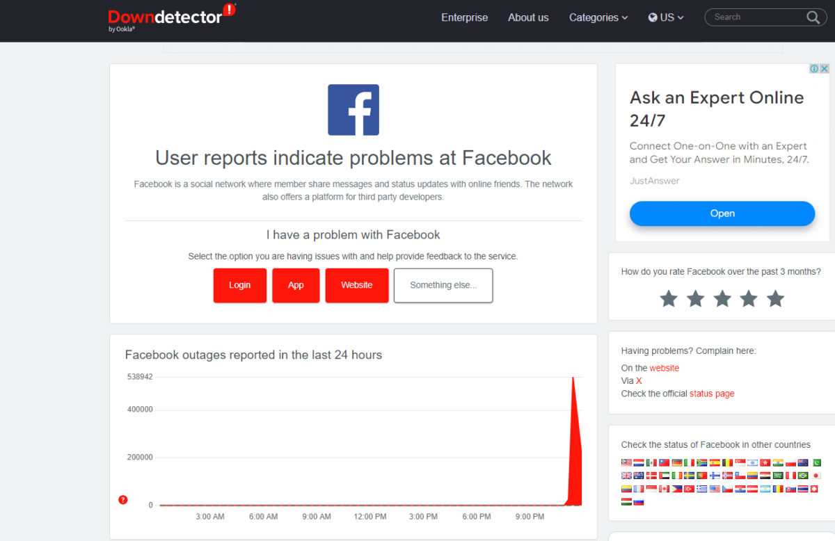 ▲ 國外監測網站Downdetectorg顯示各國均收到大量臉書用戶回報問題。