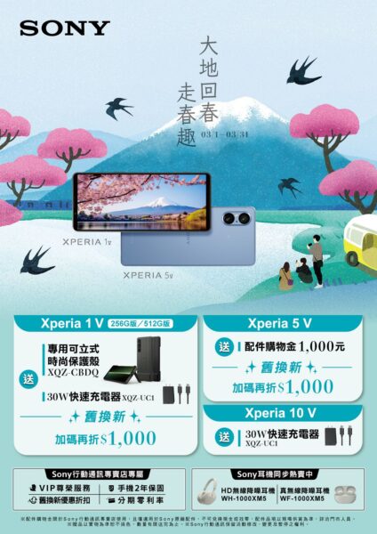 在2024年3月31日以前,到Sony專賣店購買Xperia 1 V,即贈Sony原廠30W快速充電器XQZ-UC1及專用可立式時尚保護殼XQZ-CBDQ,指定手機舊換新再折1,000元;選購年Xperia 5 V可獲得1,000元的配件購物金,及加碼舊換新1,000元折扣;挑選Xperia 10 V,可獲得30W快速充電器。