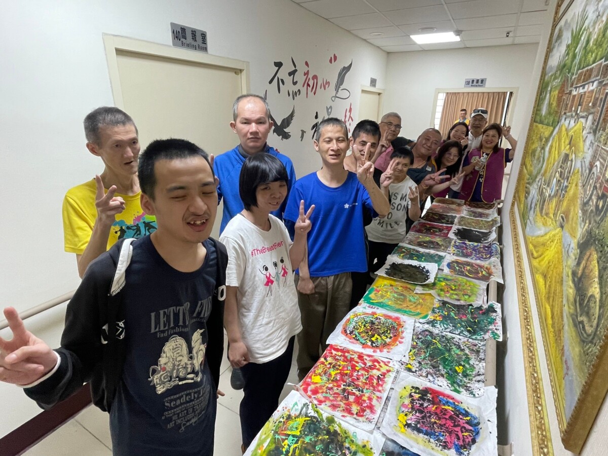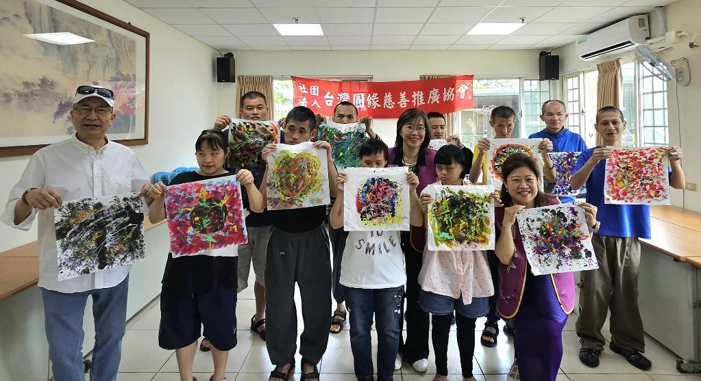 陪伴老憨兒無筆彩繪的志工服務模式下,生產許多愛心彩繪畫作做公益,是台灣圓緣慈善推廣協會持續推廣慈善的作法。2024年4月13日下午,攜手南門獅子會,前進桃園聖愛教養院,開啟一日畫室。老憨兒手拿跨界合力完成的彩繪畫作笑開懷。憨兒們一旁看顧、等待畫作風乾,後續徵求愛心者贊助裱框、購畫,響應以畫代替一次性花籃同時做公益。