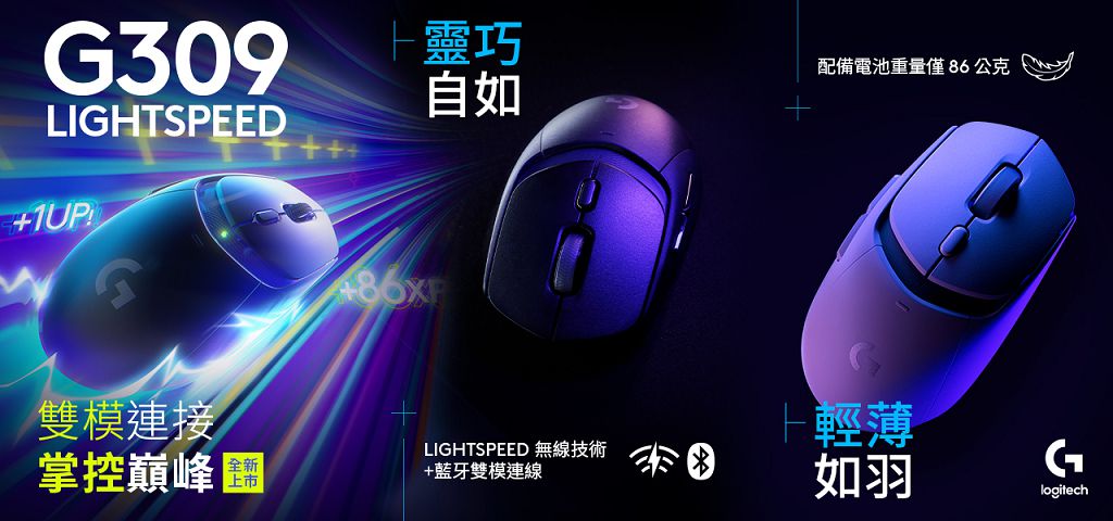 「G309 LIGHTSPEED」雙模無線遊戲滑鼠提供LIGHTSPEED 無線技術與藍牙兩種無線連線方式,玩家可任意切換,享受高靈活度的遊戲空間;並加入 LIGHTFORCE 混合微動技術,利用光學與機械觸發器提供低延遲的絕佳性能,且可降低磨損,大幅增加滑鼠耐用度和續航力。G309 LIGHTSPEED採用HERO 25K感應器,實現亞微米的精準度,進而提升10倍電源效率,延長電池使用壽命;其他亮點包含擁有6個自訂按鍵讓玩家可至G HUB自訂專屬功能鍵、300小時的續航力、裝上電池後僅86公克的輕巧重量減輕使用負擔。