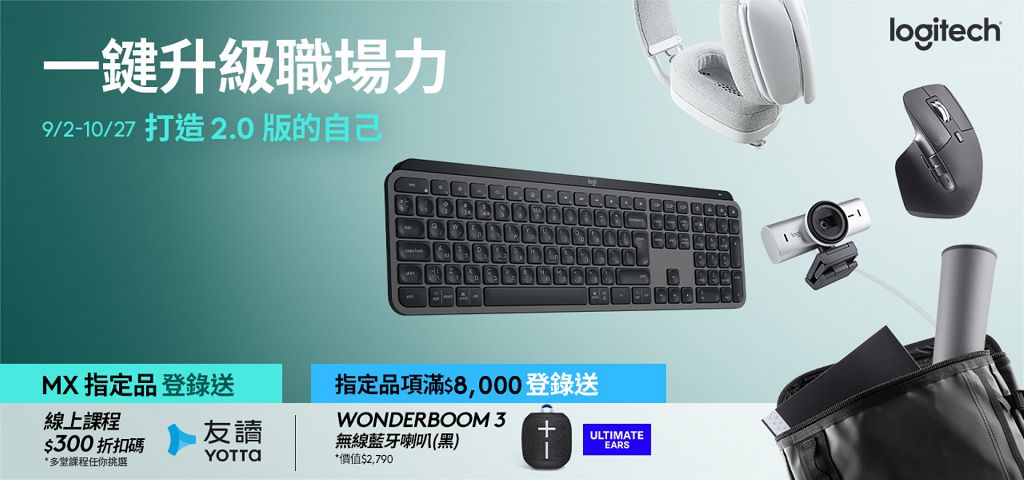 「一鍵升級職場力」活動,Logitech MX 系列高階商務鍵鼠,搭配 YOTTA 友讀線上課程,活動期間自 9 月 2 日至 10 月 27 日,凡購買 MX 指定產品,即可享有 YOTTA 友讀線上課程三百元折抵券,探索五大主題強化專業能力,多堂課程任你選!指定品消費滿 8,000 元,加碼贈送 Wonderboom 3 無線藍牙喇叭-黑色(價值 2,790 元),體驗極致音質,兼顧生活與工作。