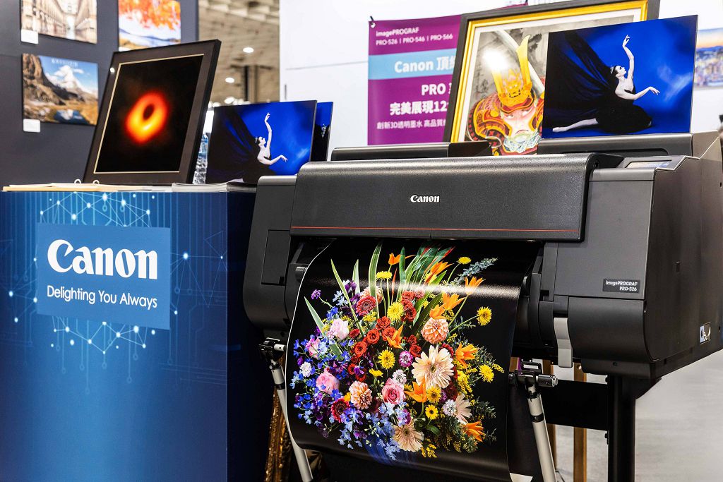 針對商用大圖輸出,現場也展示Canon 頂級12色大圖機imagePROGRAF PRO-526及輸出展品,完美呈現色彩極致美學,尤其是創新 3D 透明墨水,讓影像高品質細緻輸出,藝術經典永留存。