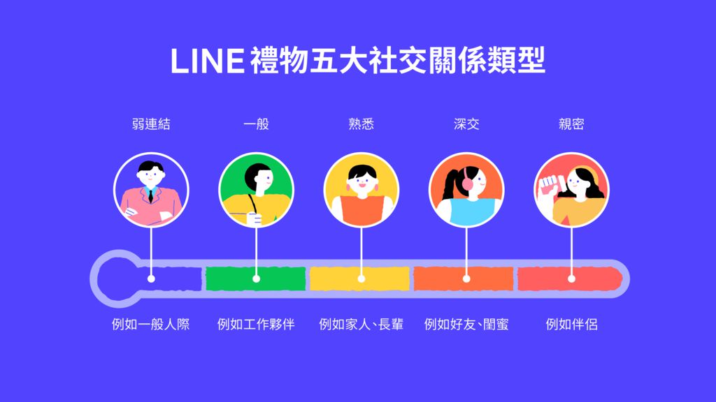LINE禮物根據過去兩年的用戶送禮頻率(次數、單/雙向送禮等)、年齡層分布以及送禮時段等指標,將社交關係劃分為弱連結、一般、熟人、深交和親密五種類型,挖掘出人際關係的不同層次與送禮行為息息相關。關係越緊密,具備親密感或個人風格的禮物越受青睞。其中,美妝保養類禮品在各類送禮族群中的佔比穩定成長,用戶的送禮預算更是顯著提升。