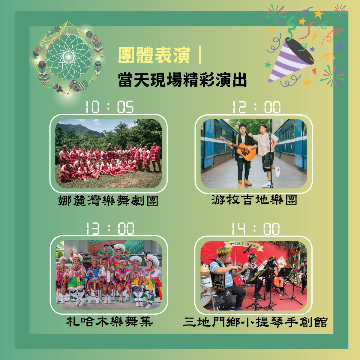 成果展當天由娜麓灣樂舞劇團表演熱鬧開場,接下來有多個特色表演及DIY體驗活動如卡片編織、敲染環保袋、手機掛繩等,展現原民獨有文化的工藝體驗;另外還有市集活動,民眾可參加打卡、集章活動外,還能參加滿額扭蛋抽獎,內容相當豐富。在原民會努力之下,112-113年共創造了3,458位族人的工作機會、增進照顧部落的長輩、孩子、行動不便或弱勢族人福利超過64萬人次。