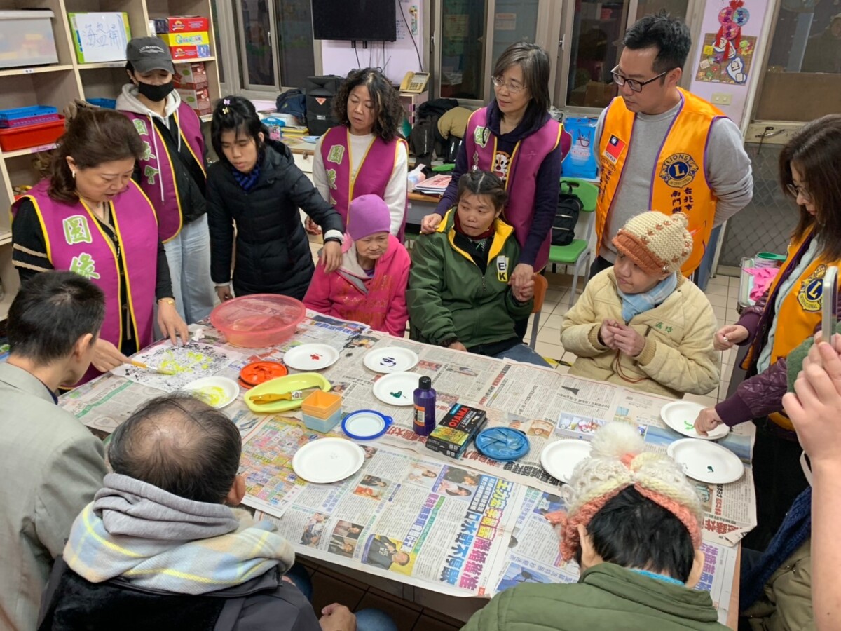 活動當天,在熟識老憨兒的圓緣會創會理事長曹晏華示範下,南門獅子會會長許士彤與輔導會長卜天鳳一起手把手陪老憨兒們,完成一幅幅充滿生命力的藝術畫作。盡情揮灑色彩,志工與老憨兒都沉浸在繽紛創作過程中,樂其中。純真笑容與專注眼神,顯露大家都純真憨厚的一面,也為寒冬注入無窮暖意。