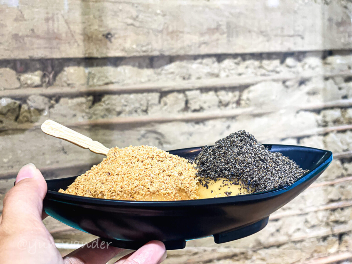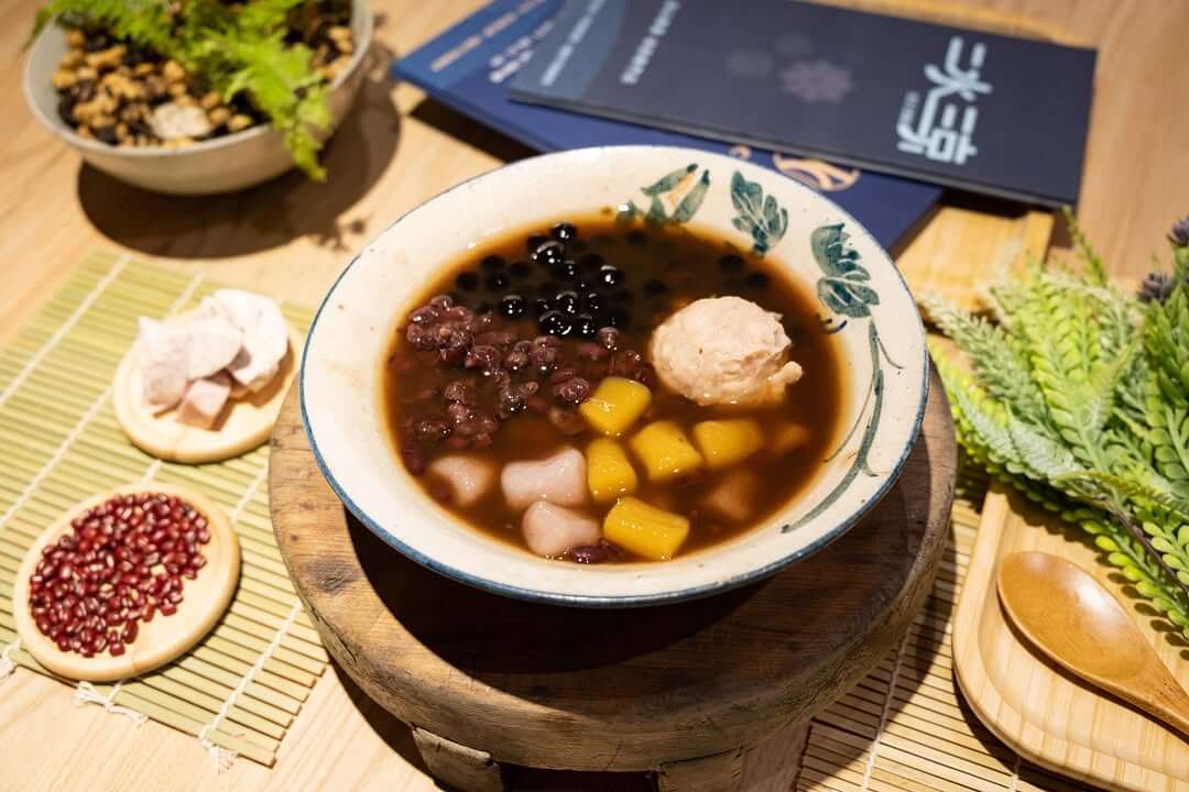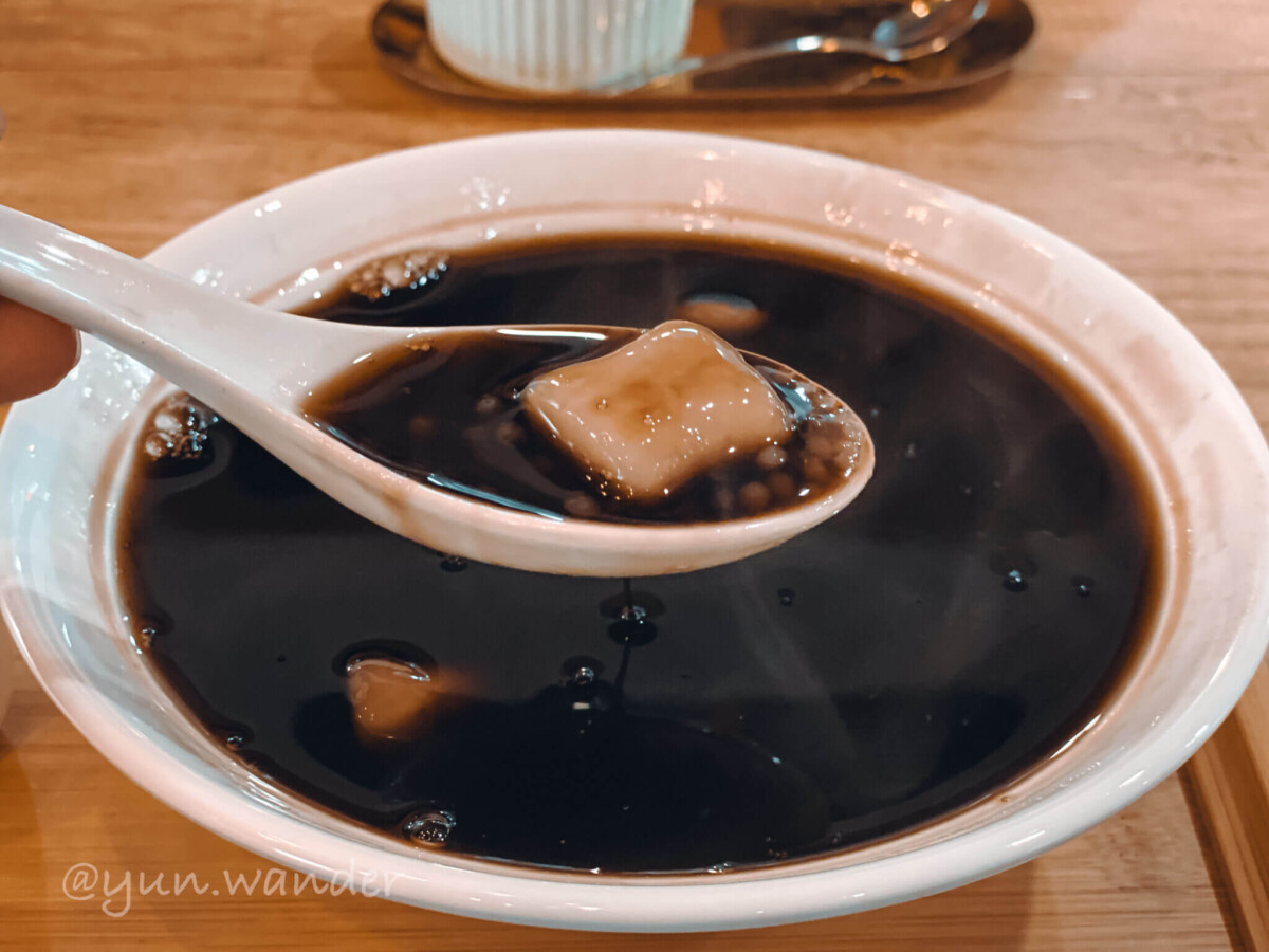 新北的二水町店內空間瀰漫著濃厚懷舊氛圍。冬季甜品系列中的招牌甜湯,以其最純粹的甜湯基底,完美展現簡單樸實的風味。湯中搭配多種配料,口感層次豐富,既有紅豆的綿密,又有芋圓與芋頭球的Q彈,再配上珍珠的細緻嚼勁,每一口都散發濃郁香氣。除此之外,烤糖椪餅花生湯也是必點之一,花生顆粒滾煮至軟而不爛,每一口都散發出濃郁的堅果香氣。搭配上椪餅的黑糖焦香,交織出層次豐富的味覺體驗,令人回味無窮。