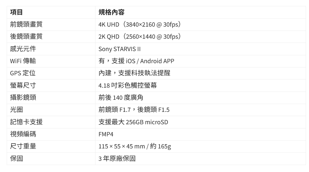 此外,內建WiFi與GPS雙模組,支援即時傳輸與全台科技執法提醒,加上穩定的緊急鎖檔與256GB記憶卡擴充,堪稱市售產品中最具競爭力的智慧車用錄影方案之一。