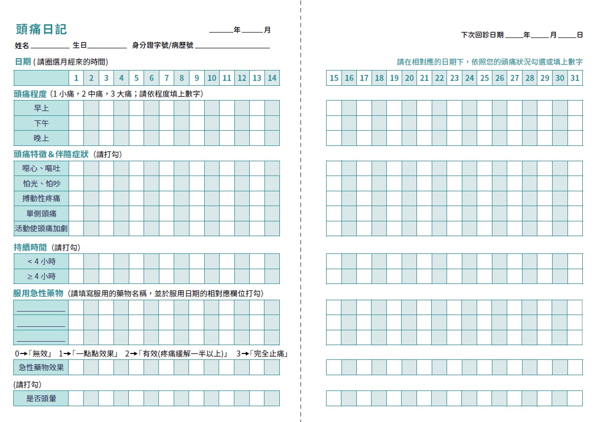 在偏頭痛治療過程中,「頭痛日記」也相當重要。頭痛日記當中會有頭痛日期、痛多久、痛在哪裡、當時在做什麼、吃什麼藥、是否有效……這些看似零碎的資訊,是醫師判斷是否需要調整用藥、已有過度使用止痛藥、是否正在惡化的重要依據。透過這些紀錄,也能找出潛在誘發因素,如熬夜、荷爾蒙變化、特定飲食、壓力、睡眠不足等,讓治療更具方向性。