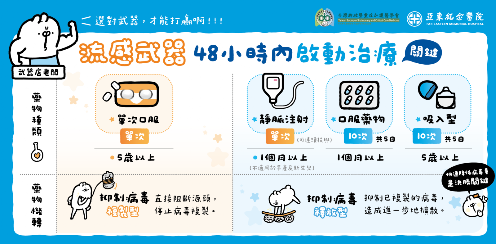 對此,面對疾病威脅與民眾認知之間的斷層,台灣胸腔暨重症加護醫學會於流感季主動出擊,攜手多間醫院推出「全民迎戰流感季—流感重症OUT!」衛教策展,提醒高風險民眾積極預防,以及掌握48小時黃金治療期。