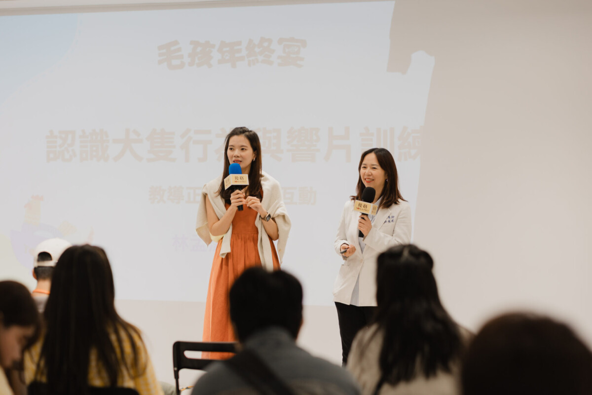 寵物行為講座環節中,主持人(左)引導飼主們跟隨獸醫師(右)的教學,進行響片訓練練習