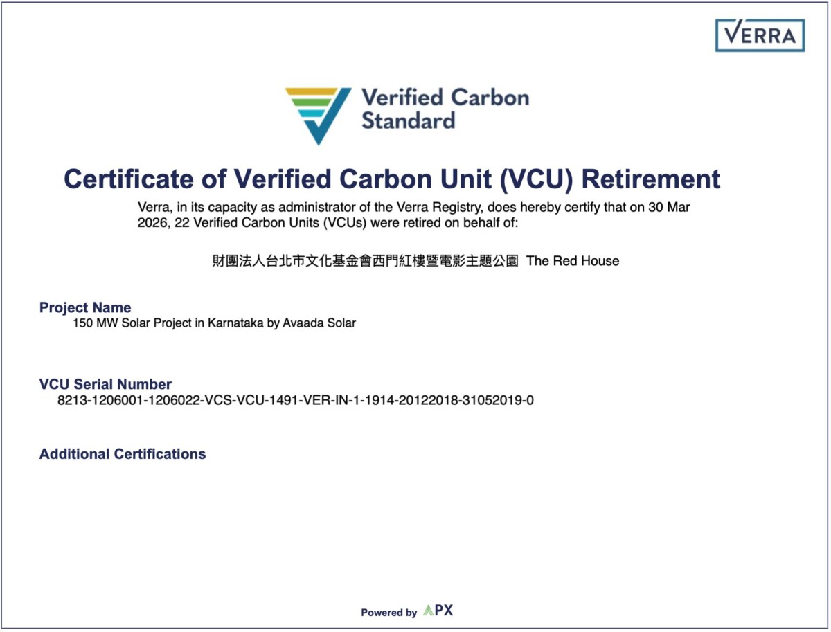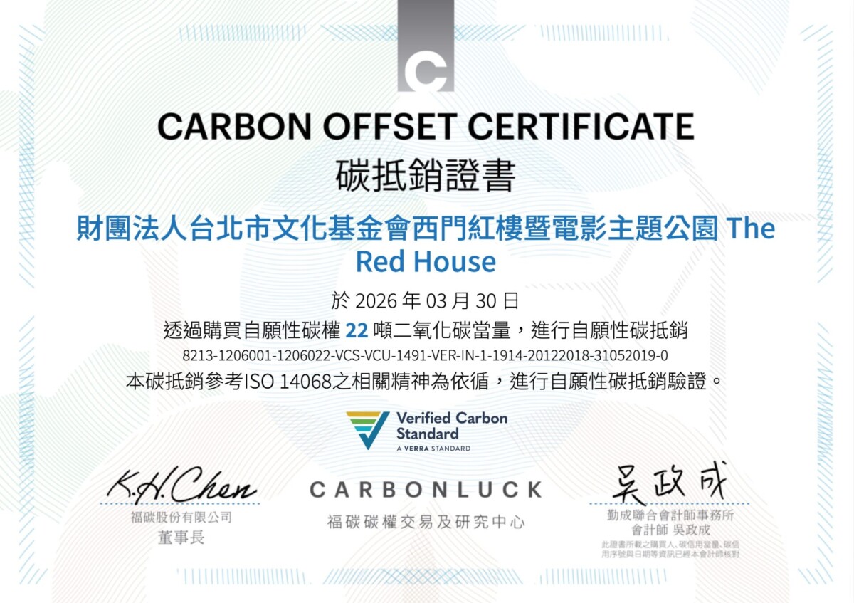 在場館營運層面,西門紅樓逐步啟動碳盤查,並導入用電管理與節能優化措施,以降低整體能源消耗;同時針對 2025 年 12 月場館用電所產生之碳排放量,透過符合 ESG 原則、具國際認可標準之碳權專案進行抵銷,完成該月份場館用電層級之碳排放抵銷,為文化場域累積具體的減碳實踐經驗。