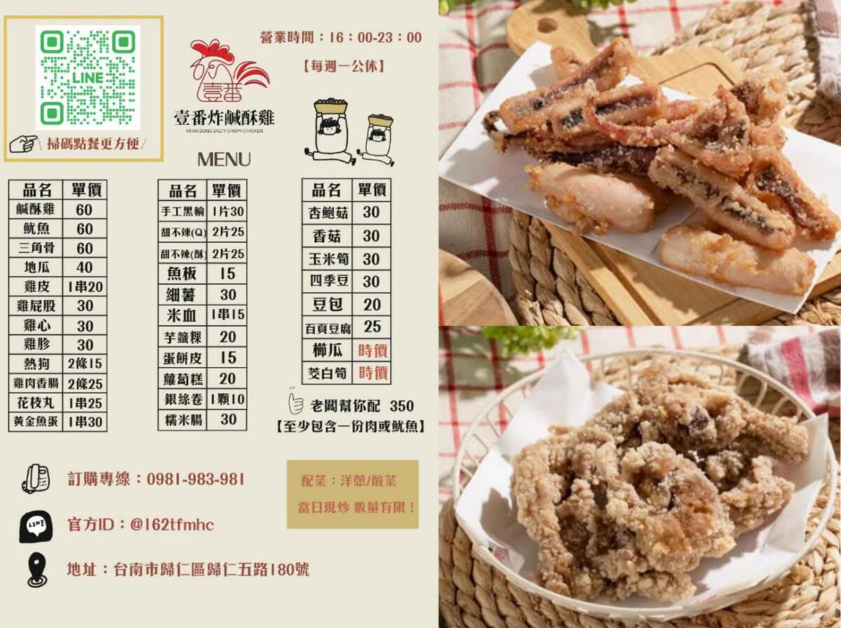 壹番炸鹹酥雞菜單種類豐富,不僅涵蓋經典美味,更有不少極具層次感的特色品項。首推老饕指名的歸仁鹹酥雞(60元)與三角骨( 60元),大塊厚實的肉品在特製醃製後,經過薄皮油炸,完整保留了台南古早味薄皮炸雞的鹹香與爆汁口感。喜歡鮮味的朋友,更不能錯過彈牙酥脆的深海魷魚(60元)與Q軟扎實的手工黑輪(30元)。而為了追求更清爽的體驗,店內的蔬菜類如四季豆、玉米筍與杏鮑菇(30元),皆以類似天婦羅的裹粉油炸法,將水分鎖在內部,帶出蔬菜天然的甜感。