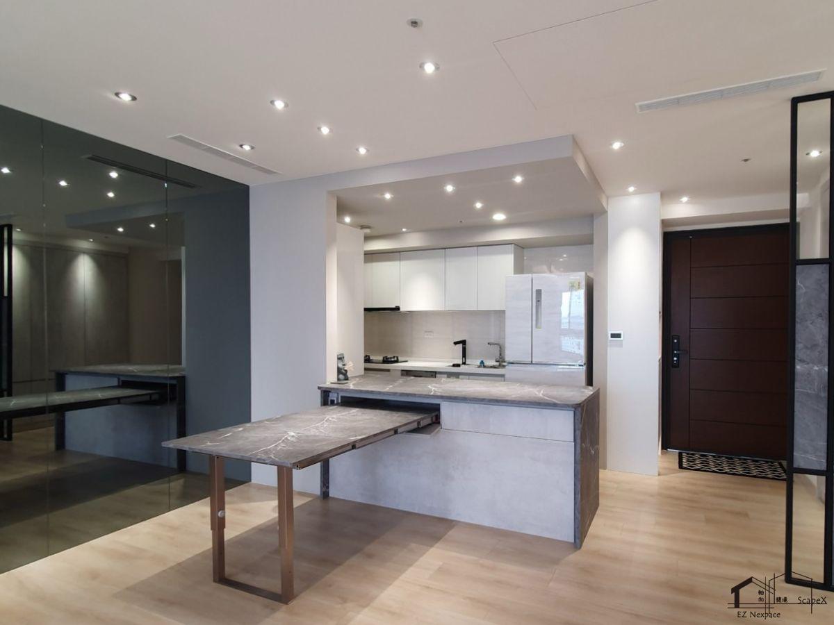 北部新成屋設計裝潢: 利用櫃體設計與家具擺放增加透視感,讓新成屋視覺坪數翻倍(圖/馥境生活概念提供)