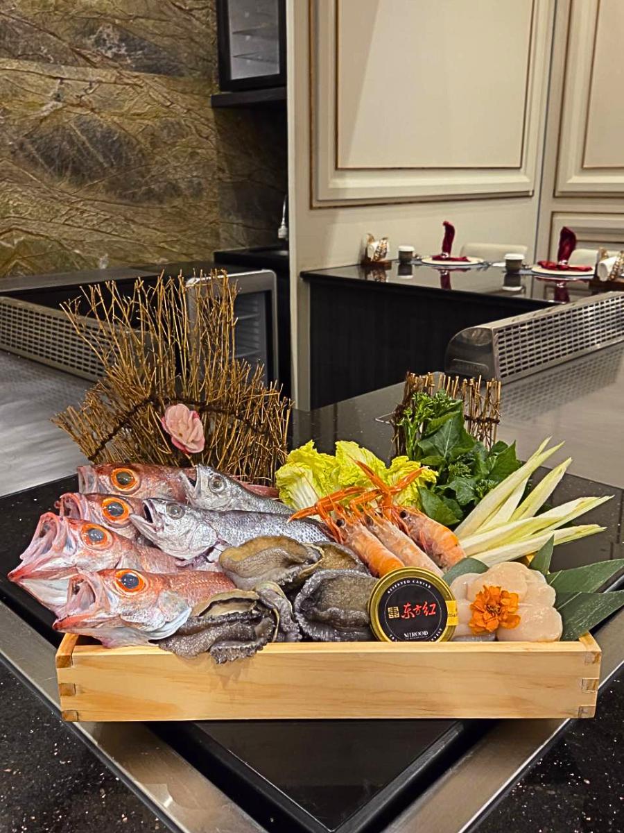 客人入座後,服務人員也會先將部分當日食材帶到桌前,像是活體鮑魚、龍蝦、干貝等,讓客人在開餐前就能先看到食材原本的樣子。整套餐大約有八到十道料理,以海鮮為主軸,約占整體內容的三分之二,最後再以肉類作為收尾。如果客人有特別偏好,也能依需求調整成全海鮮或全肉類的搭配。湯品、飲料和甜點各保留一道選項,其餘則由主廚依當日食材安排;開胃小菜則提供韓式泡菜與和風洋蔥,皆可無限續取,讓整頓飯從開場到結尾都更完整。